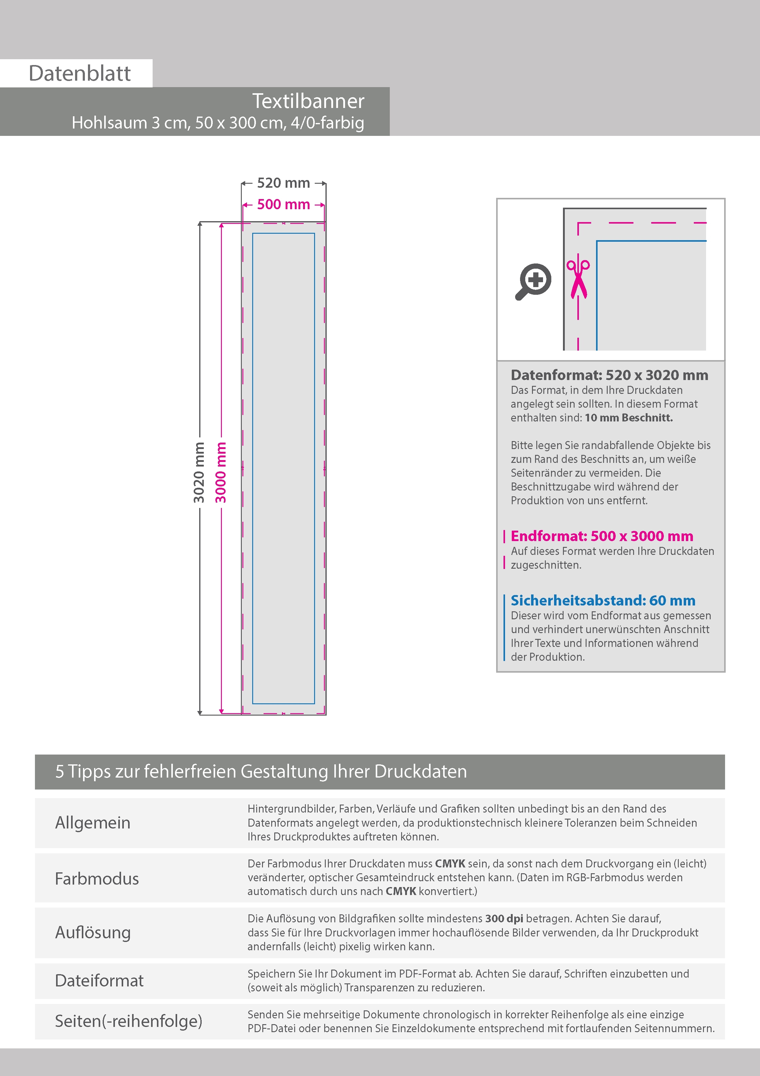Hochwertige Stoff-Banner 50 x 300 cm, 4/0-farbig bedruckt, Hohlsaum links und rechts (Durchmesser Hohlsaum 3,0 cm)