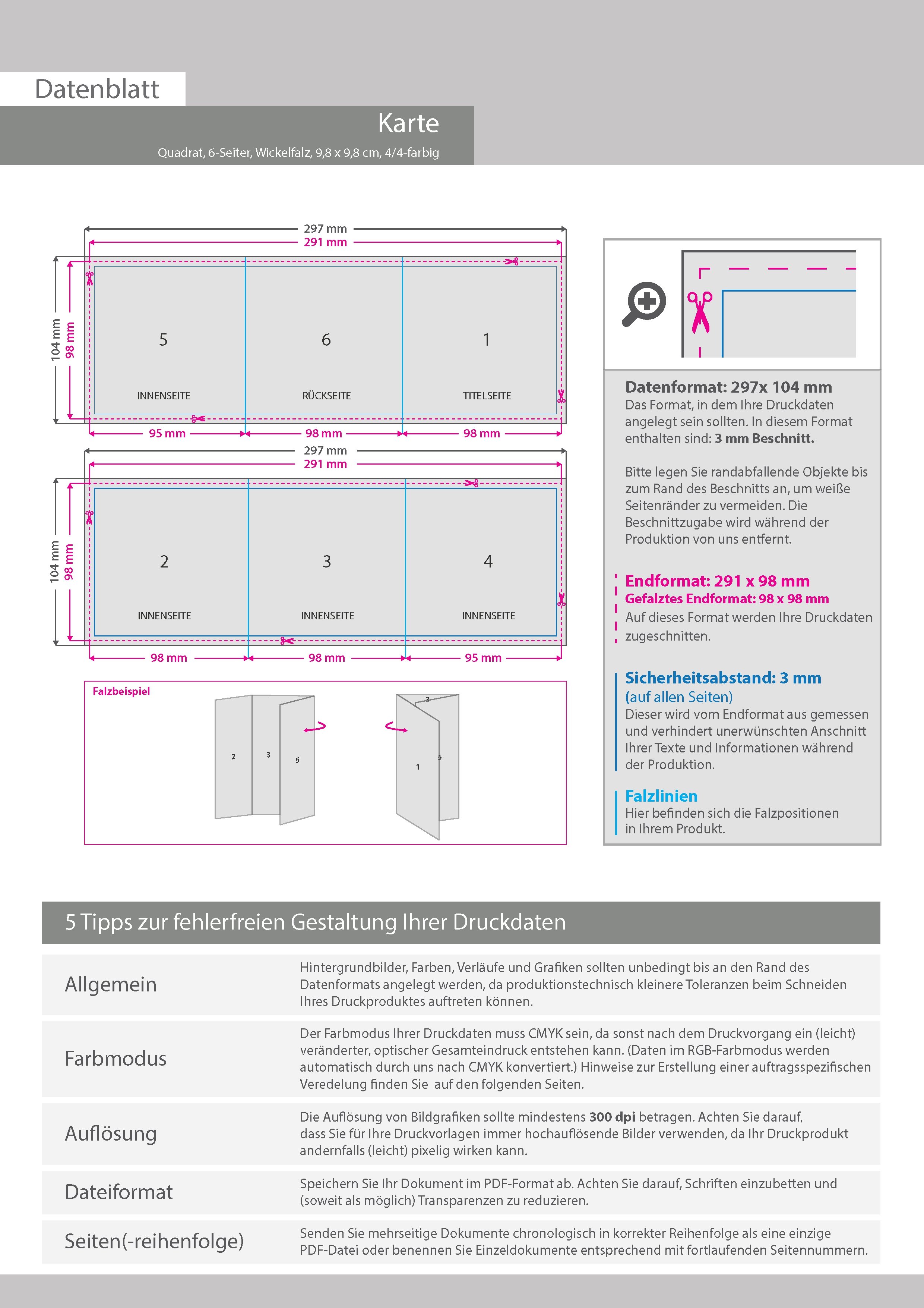 Geburtstagskarte, gefalzt auf Quadrat 9,8 cm x 9,8 cm, vertikaler Wickelfalz, 6-seitig