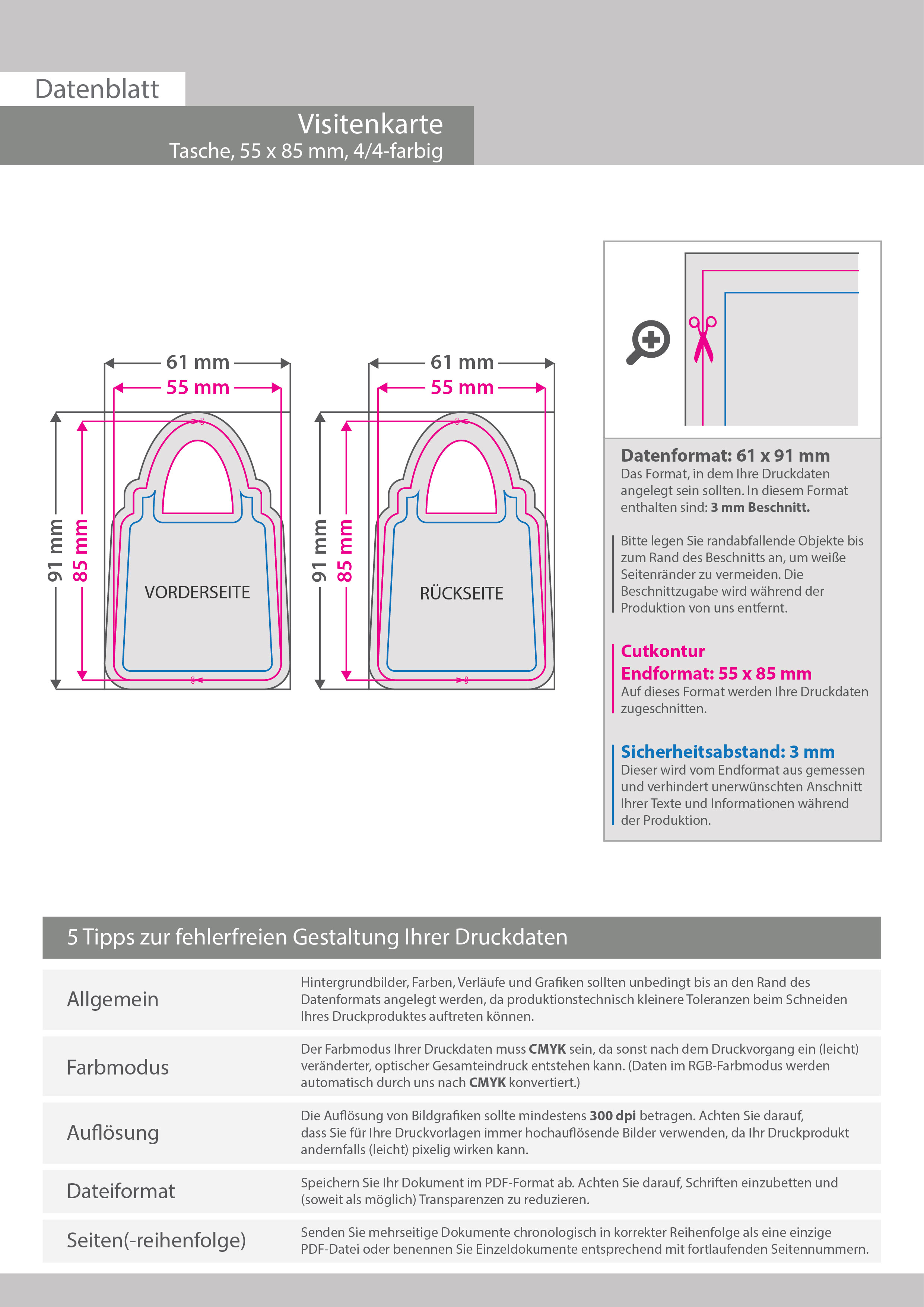 Visitenkarte Tasche, 55 x 85 mm, 2-seitig, 4/4-farbig CMYK
