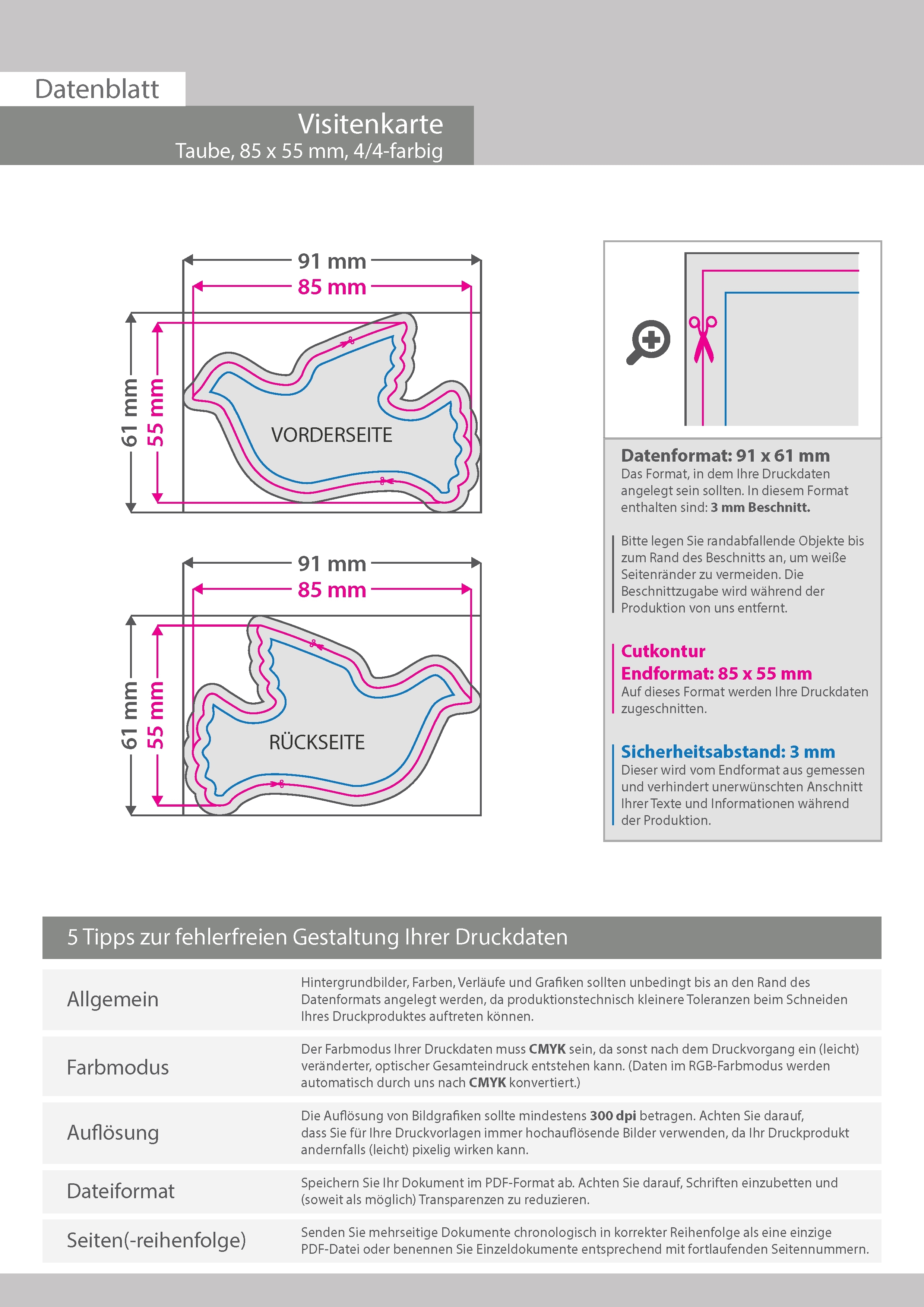 Visitenkarte Taube, 85 x 55 mm, 2-seitig, 4/4-farbig CMYK
